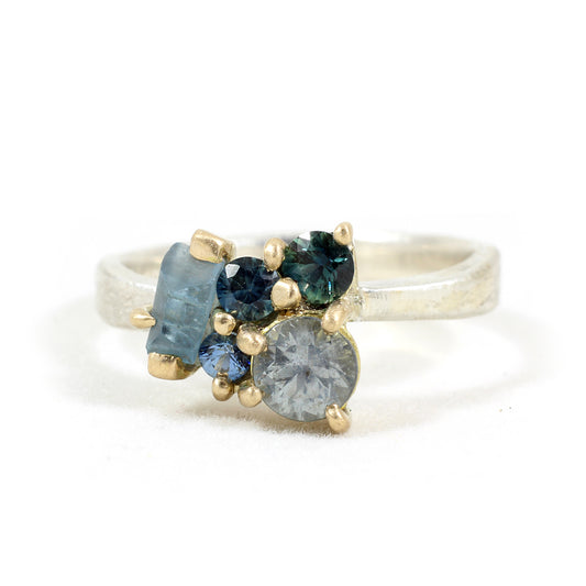 The Cassy Ring - Aquamarine and sapphire cluster ring in textured gold and silver