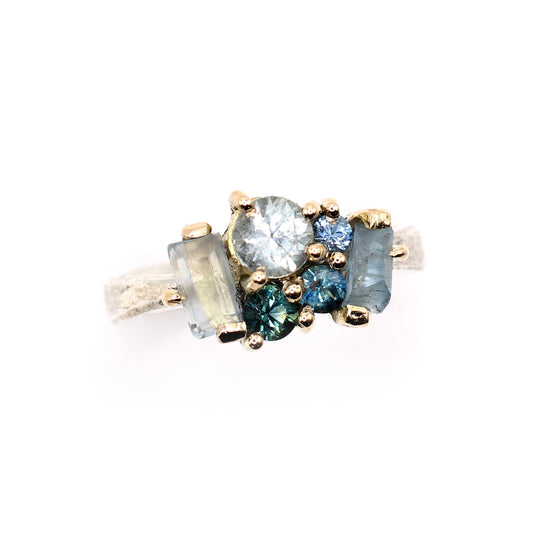 The Sarah Ring - Aquamarine and sapphire cluster ring in textured gold and silver